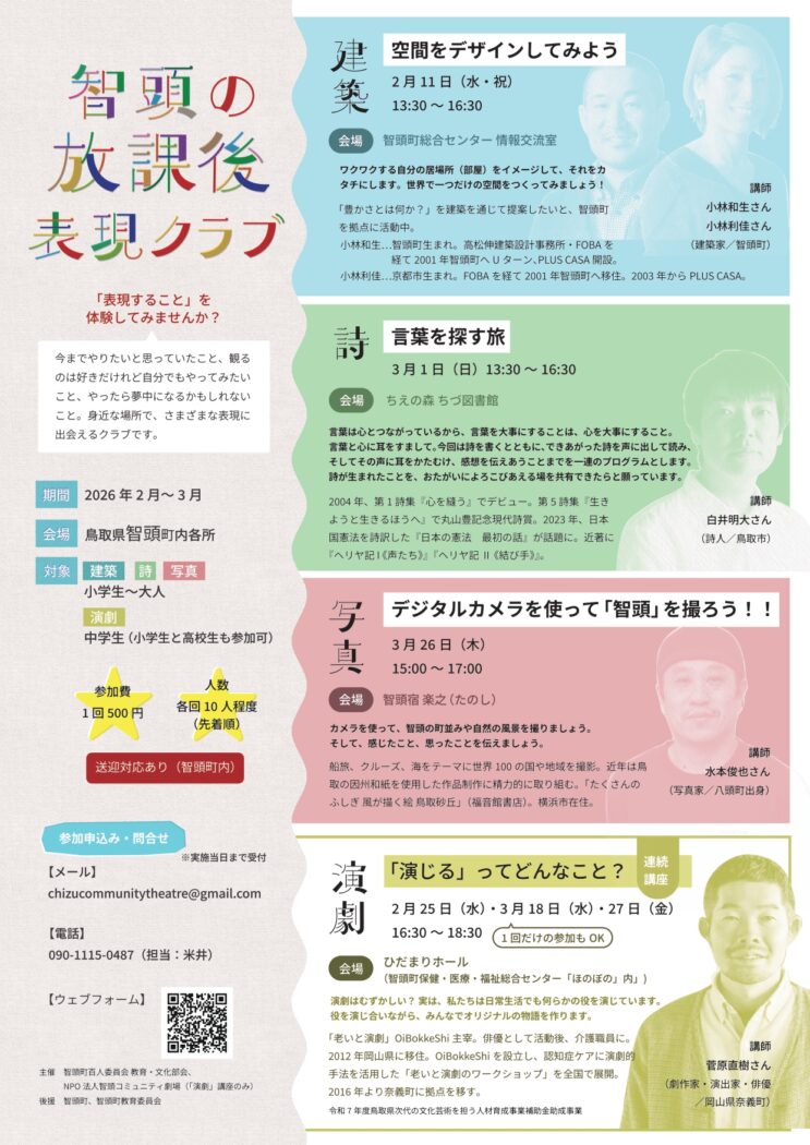智頭で芸術文化に直に触れる機会をつくろうと昨年に引き続き開かれる「智頭の放課後表現クラブ」。講師を担当するのは、いずれも智頭町や近隣地域でその分野のプロフェッショナルとして活動する方々です。今回は、「建築」「詩」「写真」「演劇」という4つのジャンルの表現を体験します。