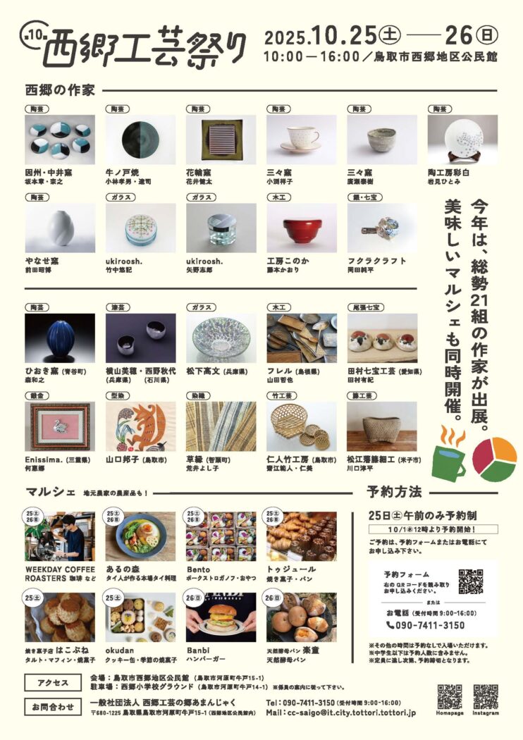 陶芸をはじめさまざまな分野の作家が在住し、2017年から「西郷工芸の郷」づくりを進めている鳥取市河原町の西郷地区。毎年秋に開催される「西郷工芸祭り」が10月25日、同町牛戸の地区公民館で始まりました。
