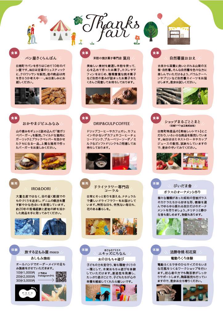 出店(順不同)|おかやまジビエみなみ、法勝寺焼松花窯、日南トマト加工株式会社「ショップまるごととまと」、自然薯屋おおえ、ドライフラワー専門店「コーラル」、パン屋さくらんぼん、子どものアトリエ ニキッズにちなん、米粉の焼き菓子専門店 葉月、DRIP & GULP COFFEE、びいだま舎 レトロガラスと古道具、IRO&DORI(イロアンドドリ)、旅する足もみ屋 moco、 HAPPY SWEETS FACTORY、 TONu(トヌ)、KitchenMINAMI