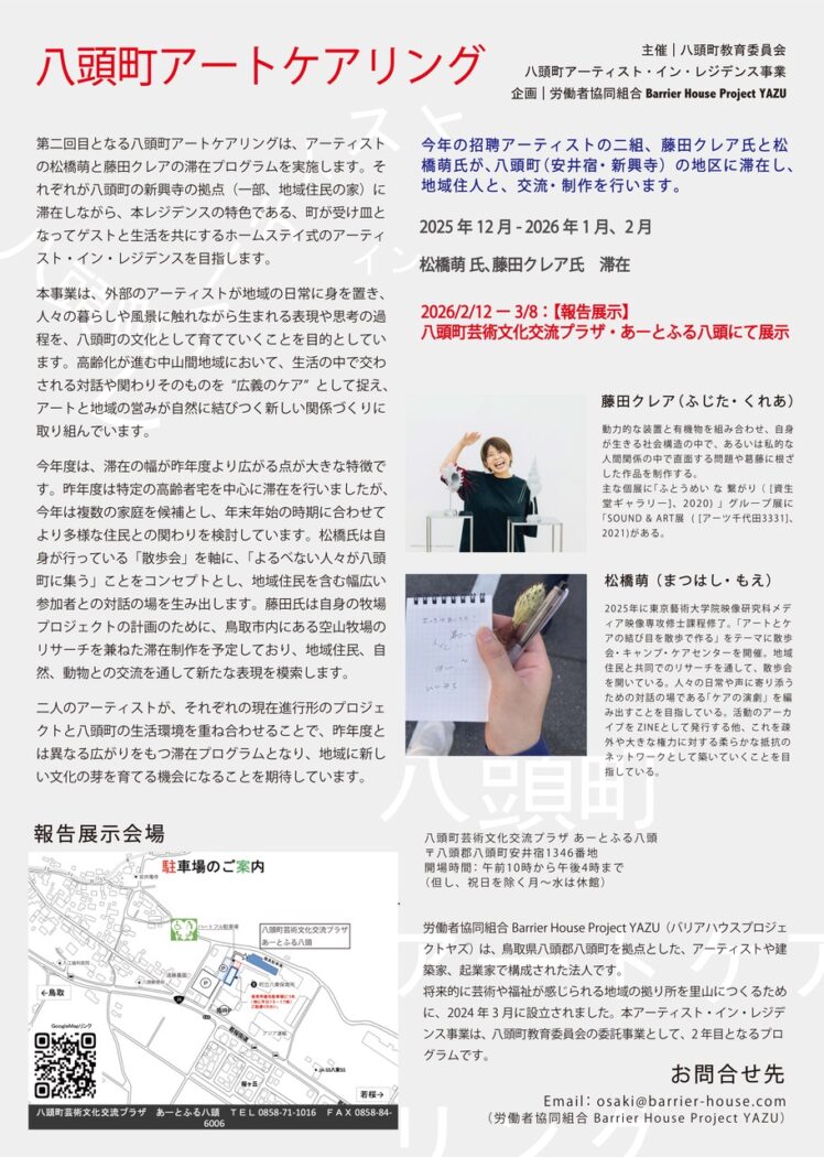 昨年度から八頭町でスタートした、アートと地域の暮らしが交わるアーティスト・イン・レジデンス事業「八頭町アートケアリング」。第2回となる今回は、アーティストの松橋 萌さんと藤田クレアさんの2名が八頭町に滞在し、地域住民との生活や対話を通じて表現を深めていきます。