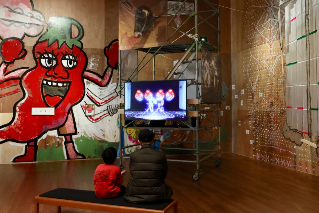 後半のシルクスクリーン印刷会は、まさに「パーティー」と呼ぶに相応しい賑やかな場になった。子どもから大人までが思い思いの版を選び、はじめは恐る恐るTシャツにプリントする。インクをのせ、スキージーを滑らせ、版を持ち上げる瞬間の小さな緊張と喜び。今回は2回目の開催ということもあり、リピーターの姿も多く見られた。経験者が自然と隣の参加者にコツを教える光景もあり、そこには指示や号令のない、自発的な繋がりが生まれていた。また、用意された版は今回の展示の一部となっているもので、CONNEXIONS展のために日中のアーティストたちが新たに制作したものだ。それぞれのイメージには作家ごとの「現在」の切り取り方や、刷音として共有してきたテーマが込められている。特に繰り返し現れるのが、唐辛子やホタテ貝、熊などの象徴的なモチーフだ。これらのモチーフの背景や意味は、CONNEXIONS展を見てもらうと理解できるようになっているので、ぜひ展示そのものを通して体験してほしい。