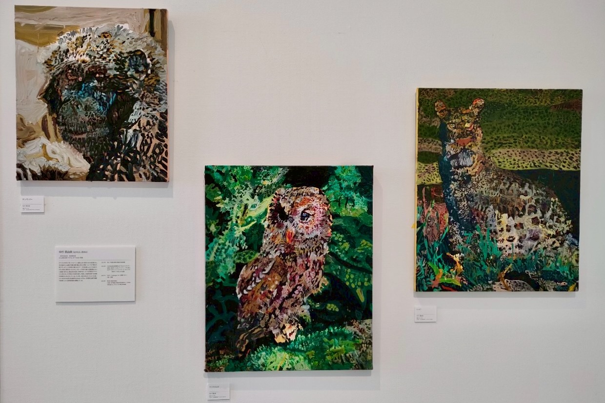 ある種、現代アート的にも見えるこれらの作品に比べ、ポップな造形や絵画も多く目立つのが本展の特徴だ。とりわけ私の目を引いたのは、中村真由美さん(たんぽぽの家アートセンターHANA)の動物をモチーフにした作品の数々である。張り子による動物の造形は、生き生きとした表情と抱き上げたくなるような大きさで、本当に動き出しそうな愛らしさがある。一方、平面の作品は、緻密なイラストから、厚塗りと点描的なストロークで動物という具象を再構成するような絵画など、幅広い。何より、彼女の色使いのオリジナルさはシグネチャーと言える作風で、こんな色使いがあるのかと感動せずにはいられなかった。