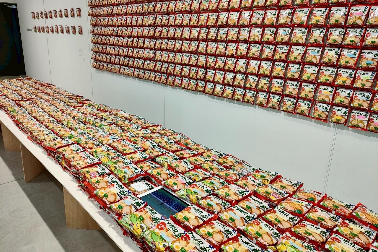 入場して真っ先に目を引くのは、酒井美穂子さん(やまなみ工房)の展示だ。壁一面にレイアウトされた無数の醤油ラーメンのパッケージ。しかも、食べた後のゴミではなく、未開封のパッケージがそのまま大量に並べられている。酒井さんは一つのものに執着を抱くようになり、朝起きてから夜眠るまでのほとんどの時間、このラーメンのパッケージを触り、音を立て、見つめ続けているのだという。パッケージには施設のスタッフによって日付が記され、彼女が日々向き合った痕跡が一つずつアーカイブされている。
