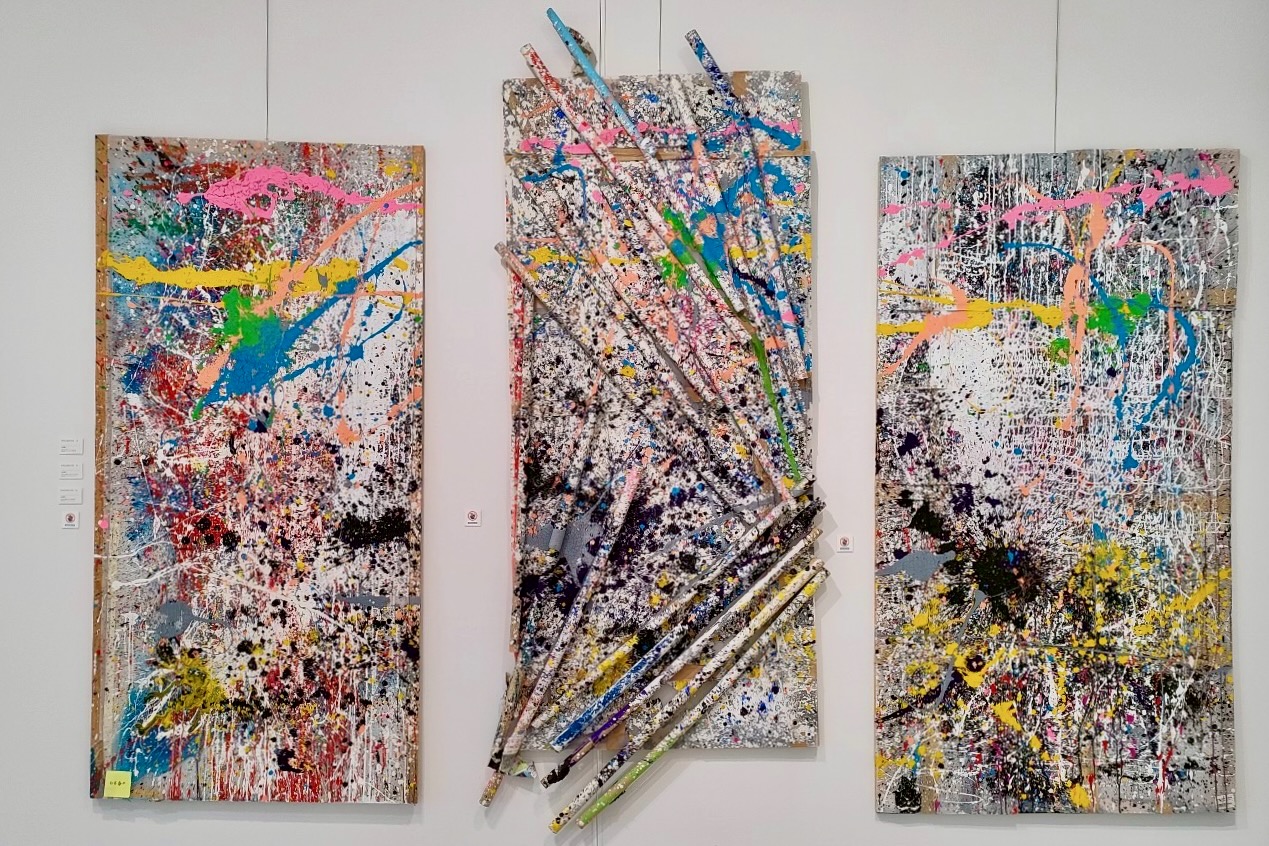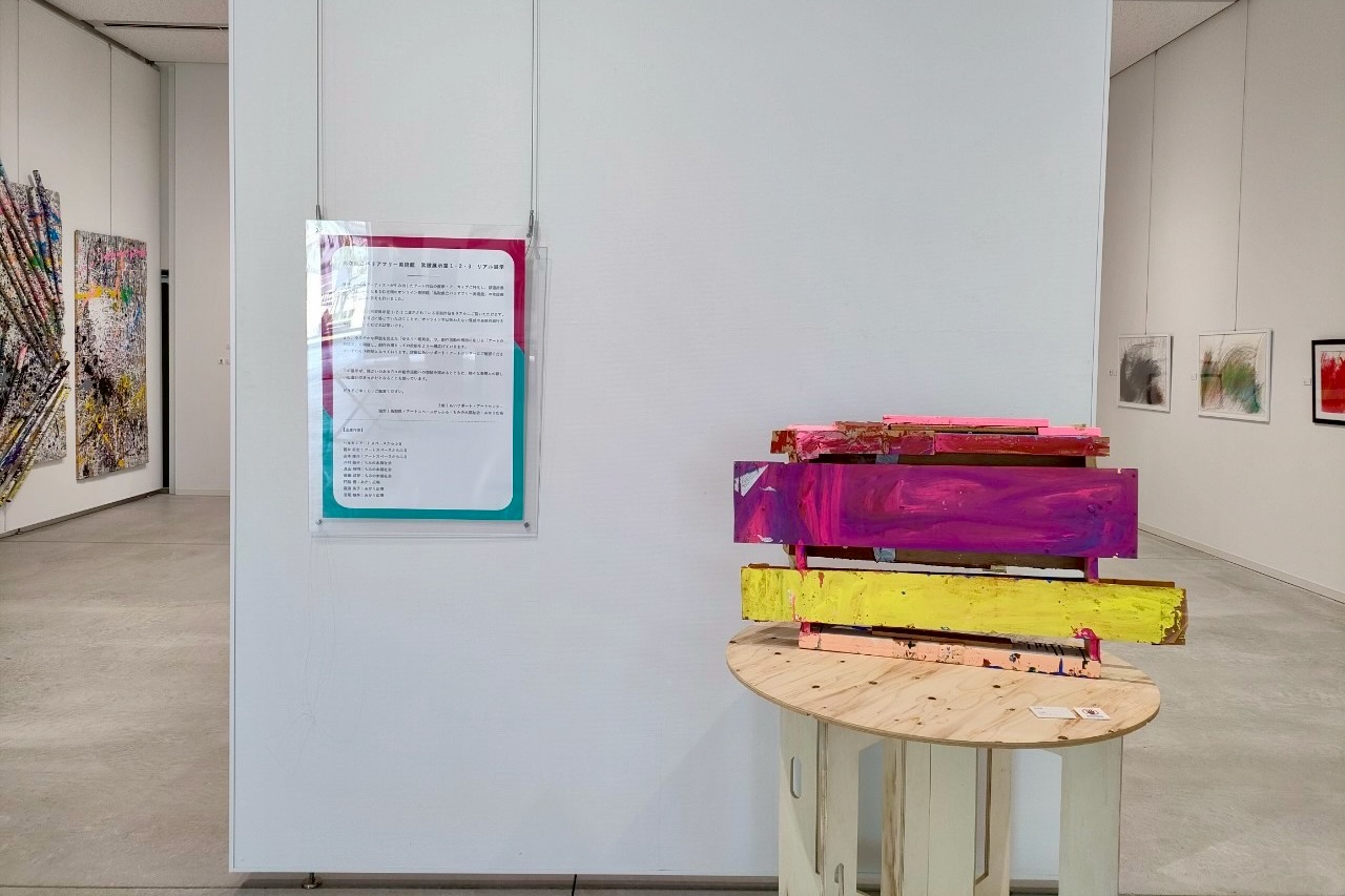 リアル展示エリアの正面で来場者を迎えるのは、山本康介さん(アートスペースからふる)の「紙芝居」だ。木とアクリル絵の具で制作された立体作品で、ビビッドなカラーリングが目に飛び込んでくる。普段はオンラインで鑑賞するバリアフリー美術館だが、素材の質感や立体の奥行きなど、あらゆる角度から詳細に鑑賞できるリアル展示は、こうした立体作品と特に相性が良い。本作品はまさに、リアル展示だからこそ真価が伝わる一点だった。同じく山本さんの「からふるのうみ」三部作も圧巻だ。巨大なキャンバスにあらゆる色をドリッピングで施した作品の迫力には、目を見張るものがあった。