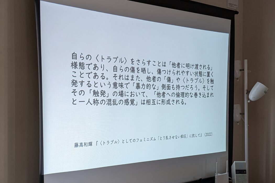 別の参加者が「みんな歌えばいい」とつぶやいた。そう、みんな歌えばいいのだ。そうやって声を上げれば、どこかの誰かの心に刺さって繋がっていくだろう。反論もディスもラップで返ってきたら上等だ。レクチャーで、「安心して取り乱せすことができる場」としてのラップという言葉が紹介された(藤高和輝著『<トラブル>としてのフェミニズム』より)。私はそれに加えて、ラップという約束事の下で安心して堂々と傷つけあうことができる場でもあるのではないかと思う。傷つくことへの過剰な配慮によって慎重に言葉を選ばなければならない一方で、匿名の力を借りたヘイトスピーチが溢れるという二極化が進む現在、rapでwrapして(ラップで包んで)吐き出せば、何かが開けて転がっていくかもしれない。